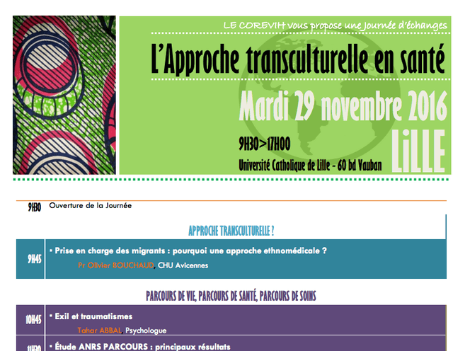 Bérénice Galliot : Alors en fait, c’est dû au contexte particulier en fait. Au sein de notre groupe de travail, il y a toujours eu les équipes de Calais. Donc à la fois le CDAG et la PASS de Calais, qui ont toujours été très investis dans le COREVIH et qui donc venait dans les groupes de travail avec leurs problématiques de prise en charge des migrants très spécifiques au littoral. On avait aussi identifié d’autres besoins sur les populations migrantes sur d’autres territoires de santé. Donc on a créé une commission migrant où on fait à la fois de la veille juridique, etc. sur les nouveaux règlements. On partage les expériences, les difficultés, les besoins et c’est vrai que même de façon assez transversal au sein du COREVIH, sans arrêt on nous disait mais on voudrait être formé à la prise en charge des migrants. Bizarrement, quelquefois ils voudraient limite à un mode d’emploi, c’est-à-dire réfléchir par nationalités. Comment on fait avec les chinois, comment on fait avec les africains ? Des personnes un peu plus expertes essayent d’expliquer que ce n’est pas forcément comme ça qu’il faut réfléchir. Donc du coup, on est parti sur l’idée de faire une journée d’échanges là-dessus. Ca répondait à un réel besoin au sein du COREVIH mais bizarrement, là aujourd’hui les gens inscrits sont des gens, ça a brassé beaucoup plus de monde que ça. Donc voilà, c’est venu de là. Du contexte du littoral avec leur problématiques qui se sont greffés ou pas avec les problématiques des acteurs de la métropole lilloise, on a abouti à cette journée, à mesure de réflexion.