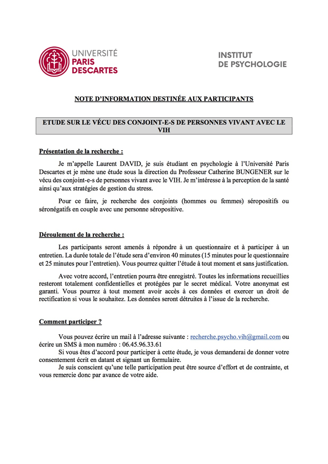 Laurent David : Si vous voulez participer, je peux donner le mail recherche.psycho.vih@gmail.com . Je vous répondrai avec grand plaisir.