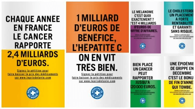 “Nous attirons tout particulièrement votre attention sur le risque de réactions négatives que pourrait susciter l’axe de communication choisi, de la part des représentants de l’industrie pharmaceutique. En effet les entreprises ainsi mises en causes pourraient estimer qu’une telle campagne porte atteinte à leur image et leur cause un grave préjudice et décider d’agir en ce sens.” Suite à l’avis défavorable de l’ARPP, Médiatransports renvoie un avis négatif à Médecins du Monde. Mais cela ne s’arrête pas là. L’ONG va alors solliciter d’autres afficheurs, parmi lesquels JC Decaux ou le réseau d’affichage Insert. Aucun ne donnera suite et pour cause: le “conseil” de l’ARPP a été “circularisé”, c’est-à-dire envoyé à toutes les sociétés. Une pratique habituelle, mais qui aurait pu être bloquée par Médiatransports. » Fin de la citation.