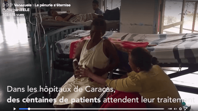 Le 26 mai le média français I-Télé publiait une vidéo, un cours reportage dans lequel on peut voir en images la situation médicale du pays. Le texte en commentaire de la vidéo indique ceci : “Dans les hôpitaux de Caracas, des centaines de patients attendent leur traitement, parfois, ce sont les familles qui doivent fournir médicaments, repas, et draps, la monnaie nationale s’est effondrée avec la chute des prix du pétrôle, le prix des produits importés a explosé et le FMI s’attend cette année à une inflation de 700%, chaque jour, de longues queues se forment devant les supermarchés de Caracas, le rationnement et le contrôle des prix par l’Etat sont devenus la norme depuis 2015, le 23 mai, le gouvernement a multiplié par dix le prix de la farine de maïs”. Vénézuela, la pénurie s’éternise, c’est une vidéo du site I-Télé.