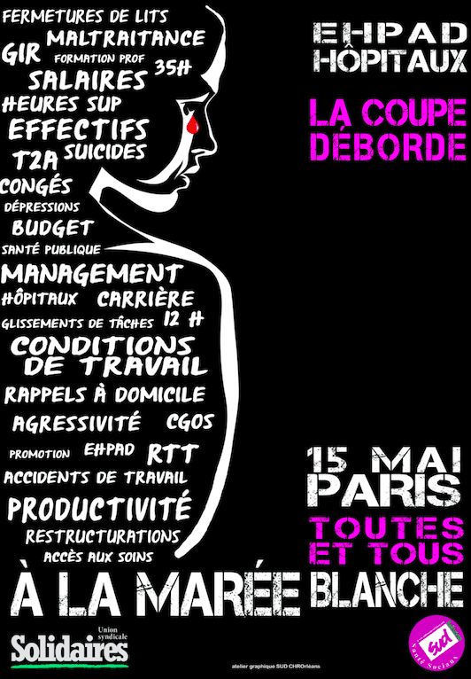 Et ce mardi 15 mai, je vous rappelle que l’émission est enregistrée et là, à l’heure où je vous parle, nous sommes le mardi 15 mai, une marée blanche est organisée ! Sur le tract on peut lire dans un nuage de mots “ Fermeture de lits, conditions de travails,dépression, suicides, accidents de travail, heures supplémentaires, budgets, maltraitance”, etc, “EHPAD, Hôpitaux, la coupe déborde 15 mai Paris, toutes et tous à la marée blanche.
